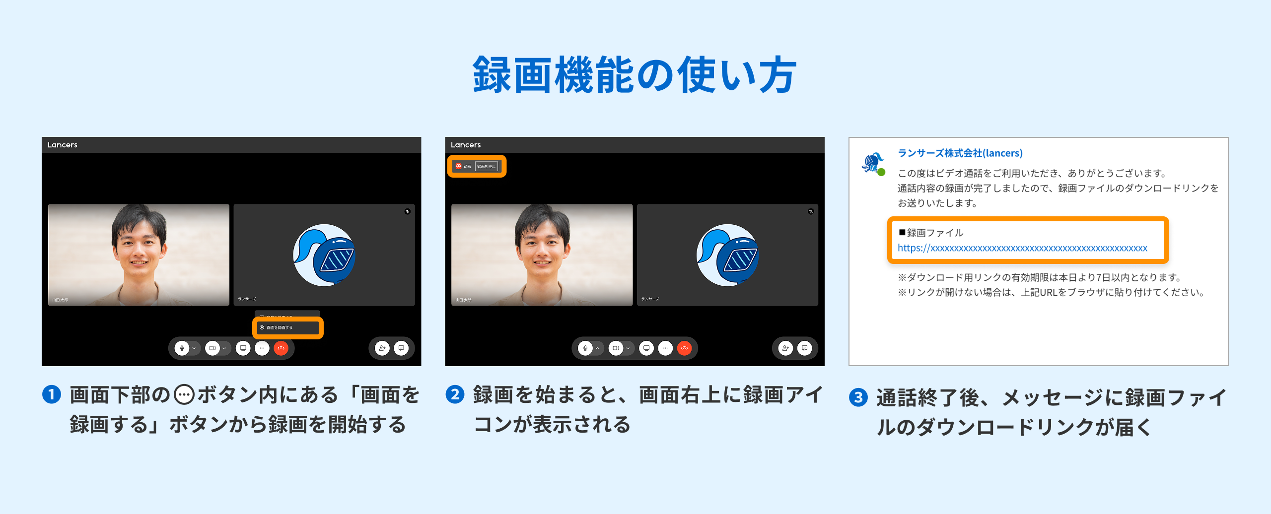 録画ファイルは通話終了後に受信するメッセージからダウンロードでき、関係者に共有することが可能です。