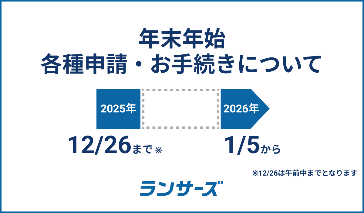 2025年12月26日(金)午後〜2026年1月4日(日)の期間に下記申請をいただいた場合、2026年1月5日(月)より順次対応させていただきます。