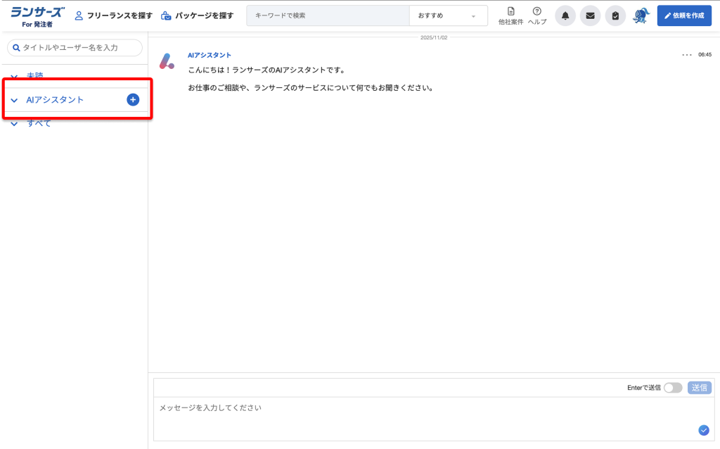 本機能は、AIエージェントがクライアントの皆さまの課題や疑問を汲み取り、最適なランサーやパッケージの提案、サービスの使い方までサポートするチャット機能です。
