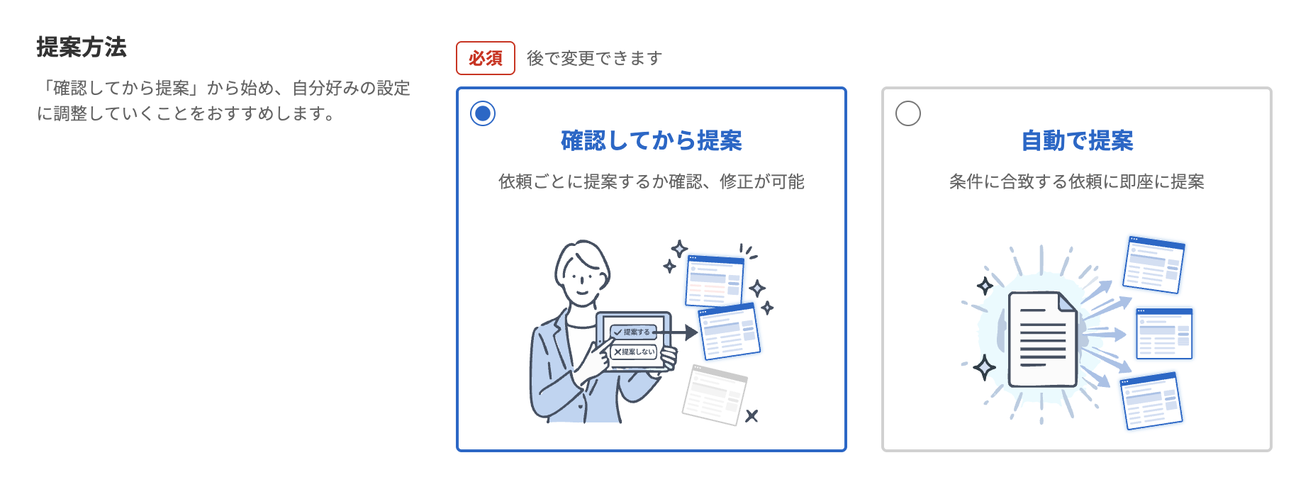 提案方法で「自動で提案」設定されているランサーの皆さまには、適用日時以降「確認してから提案」に自動で移行させていただきます。
